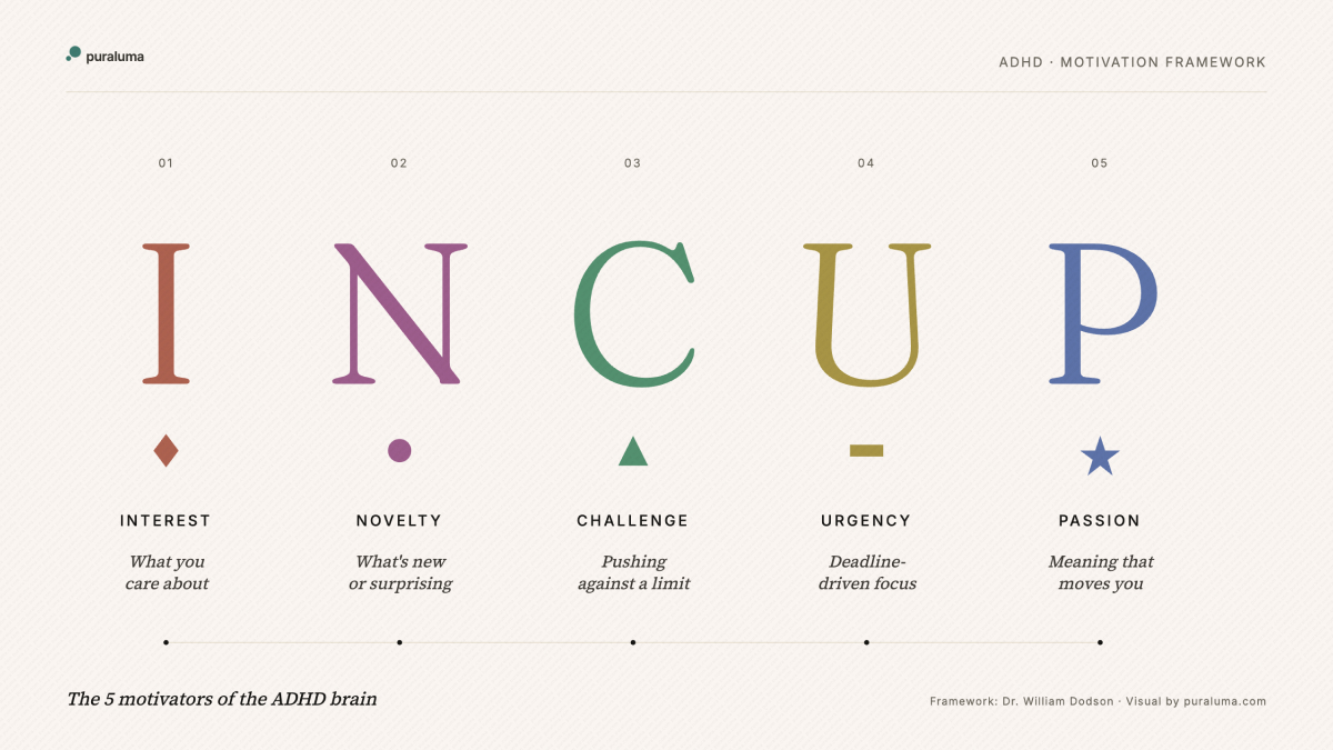 The 5 motivators of the ADHD brain: Interest, Novelty, Challenge, Urgency, Passion. A visual reference for coaches and clients.